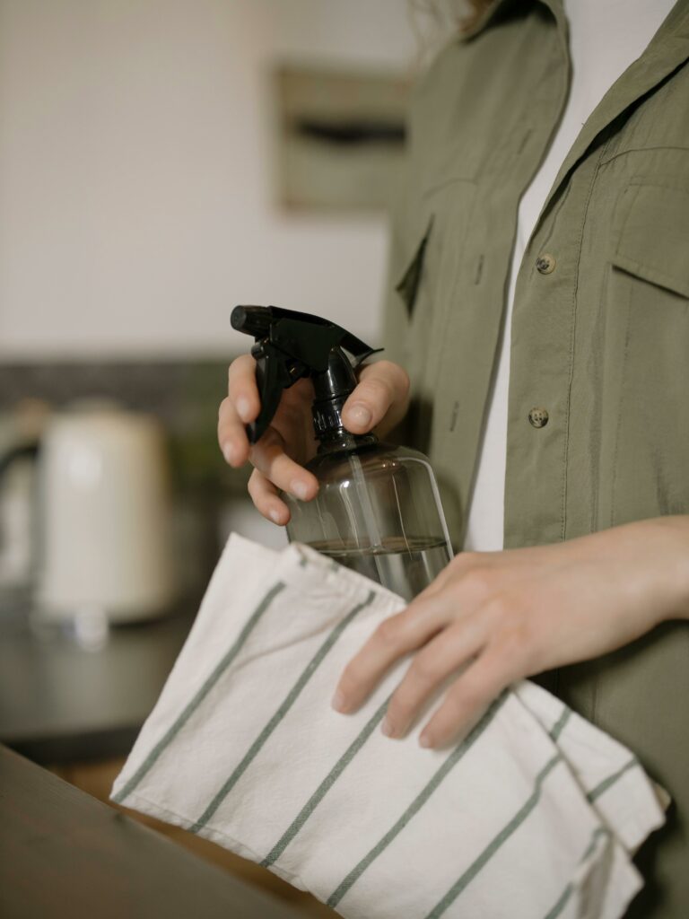 Mélangez dans un flacon vaporisateur 1 cuillère à soupe de vinaigre blanc ménager, 7 à 10 gouttes d’huile essentielle d’arbre à thé et 0,5 L d’eau.